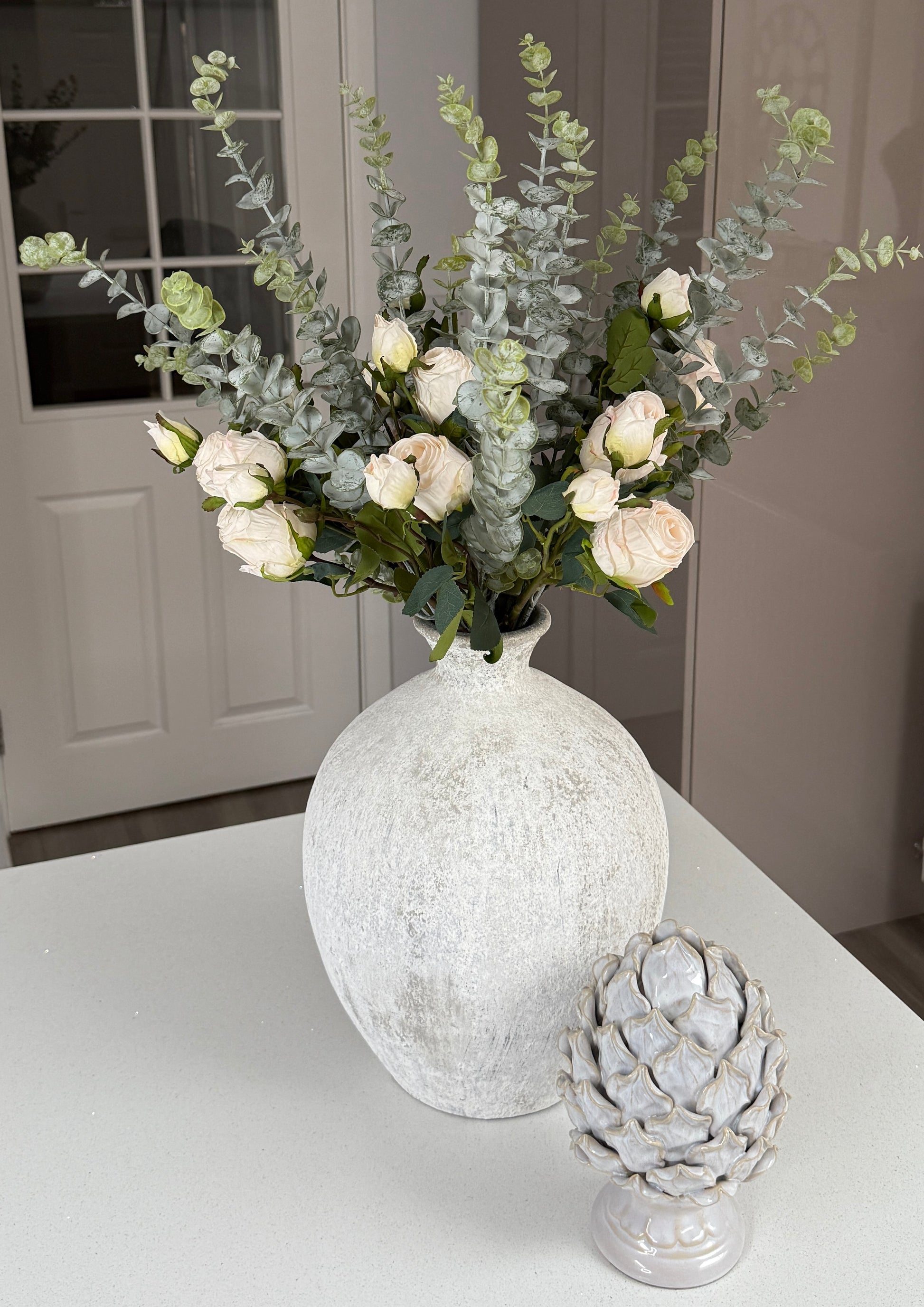 Elevate your space with the Cream Rosebud and Eucalyptus Bunch. This stylish arrangement features realistic cream rosebuds complemented by soft muted tones of eucalyptus, creating a stunning centrepiece. Perfect for refreshing your home or as a thoughtful Valentine's gift, it brings a stylish touch to any space.