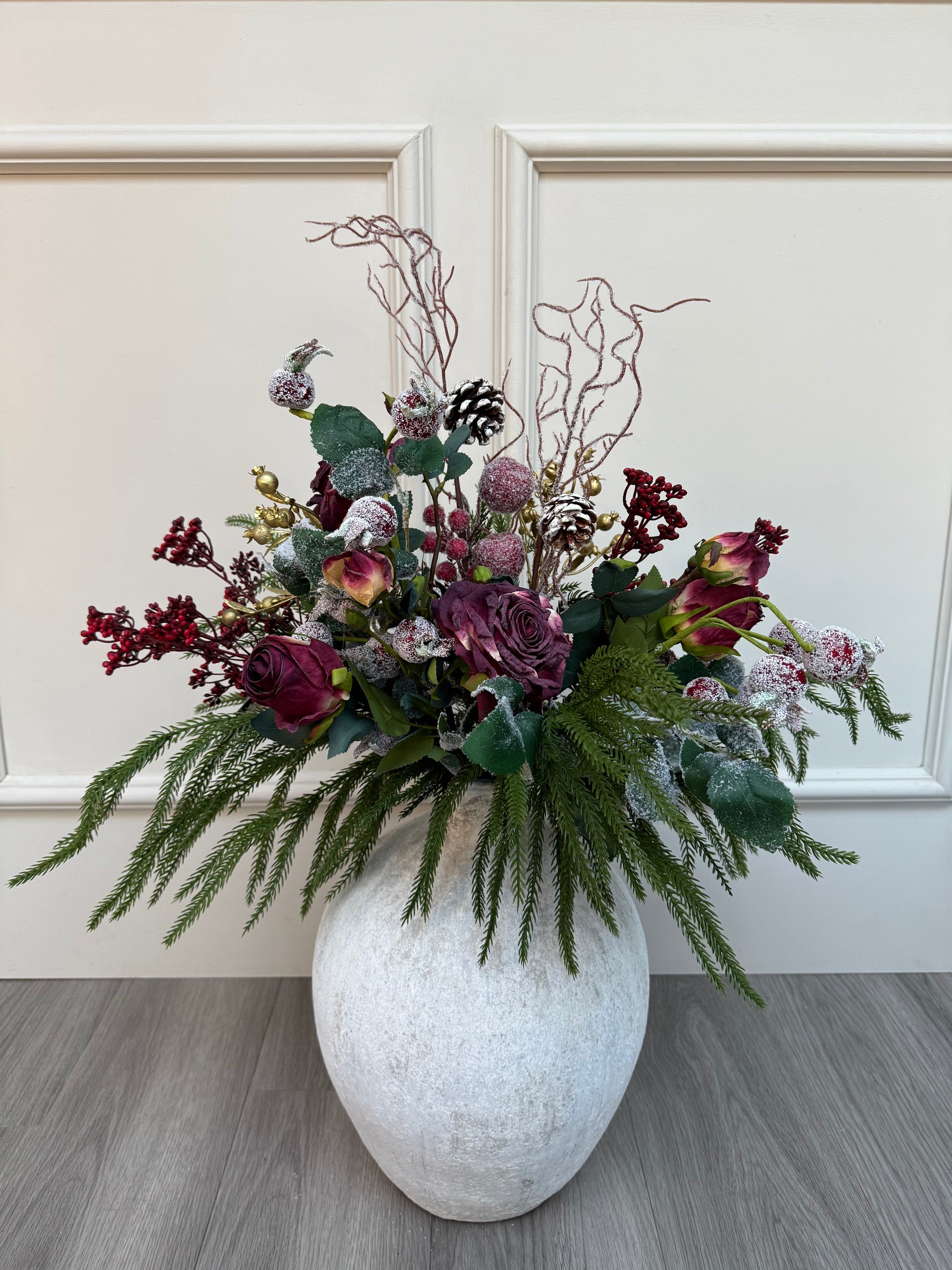 Elevate your holiday décor with the Luxury Faux Winter Mulberry Rose and Pine Frosted Bunch. This impressive arrangement features weeping real-touch Norfolk pine, glistening hawthorn berries, frosted rosehips, winter twigs with red berries and pine cones and mulberry roses. Its rich textures and colours create an impressive focal point that lasts all season making it perfect for festive styling or as a thoughtful gift that stands out.