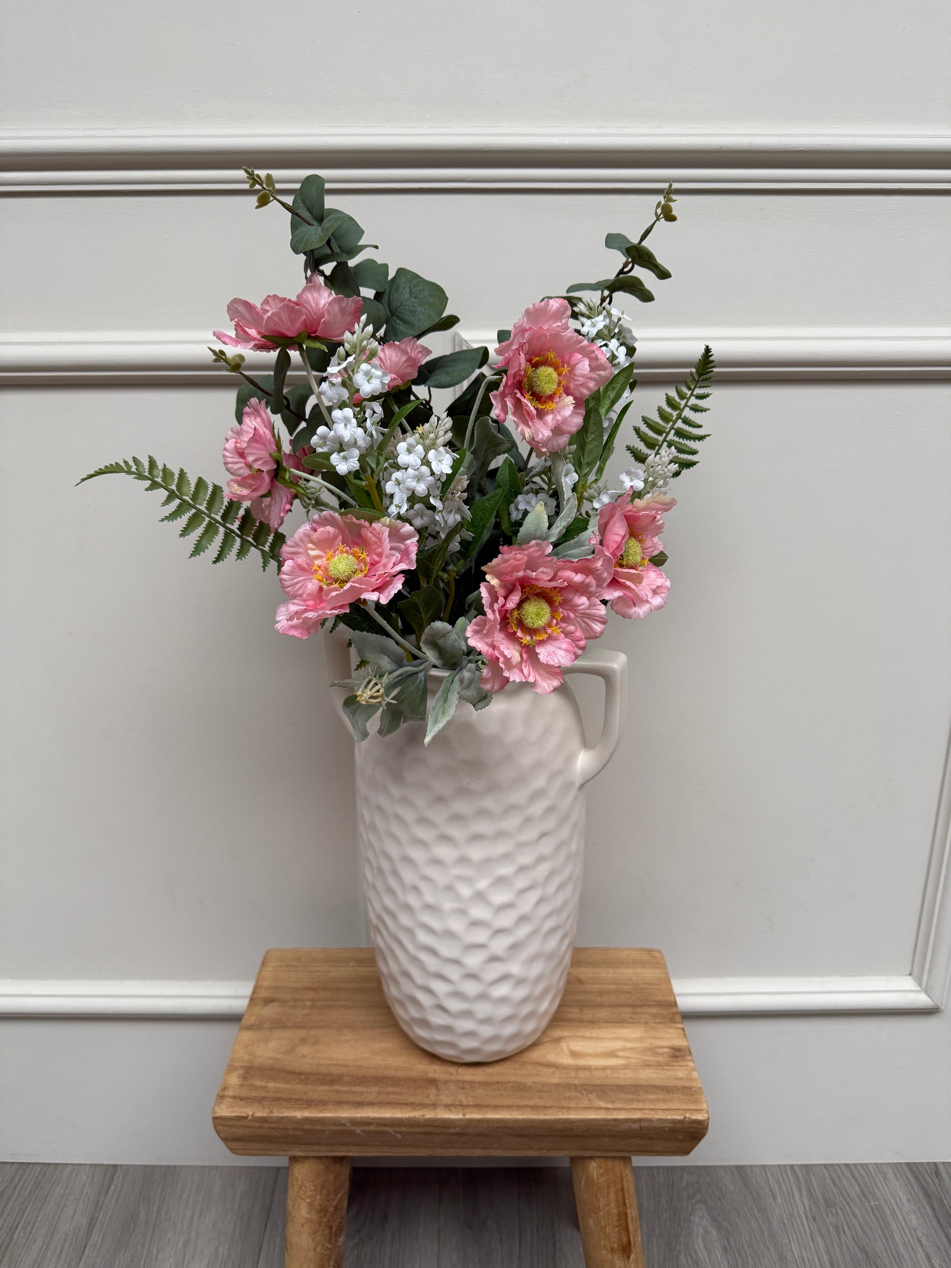 Transform your space with this dreamy faux Pink Frilly Scabiosa, Fern and Eucalyptus Bunch. Soft pink frilly scabiosa is beautifully complemented by delicate fern and eucalyptus greenery. Perfect for creating those effortlessly curated moments—style it in a statement vase, layer it into your existing décor, or use it as a stunning table focal point. No watering, no fuss, just that botanical beauty that keeps on giving.