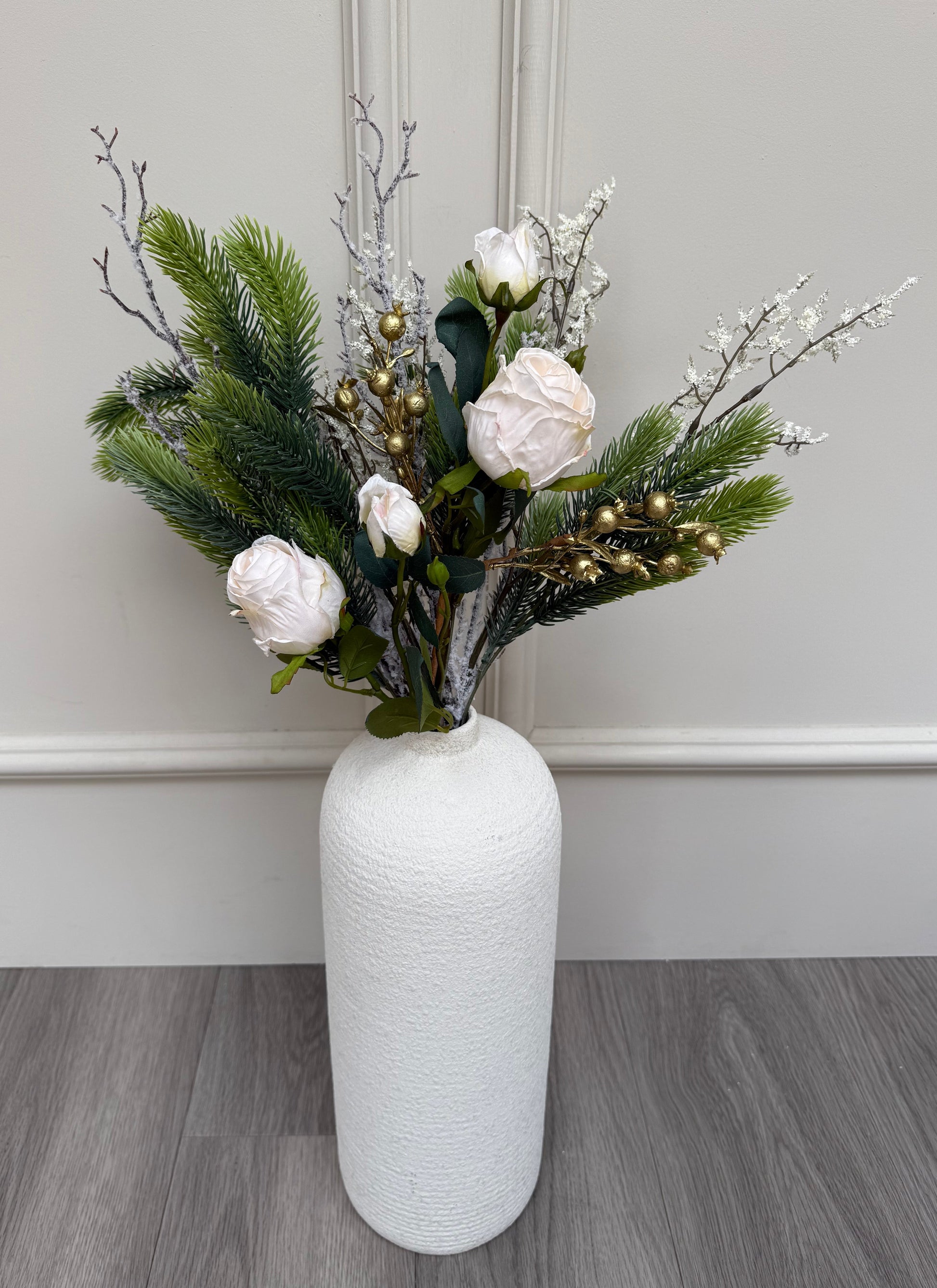 Elevate your seasonal décor with the Small Faux Cream Rose and Spruce Bunch. This chic arrangement blends soft cream roses with festive spruce, snowy twigs and shimmering gold hawthorn berries for a stylish, wintry touch. Perfect for adding effortless style to any space, it keeps your holiday décor fresh all season long without any fuss.