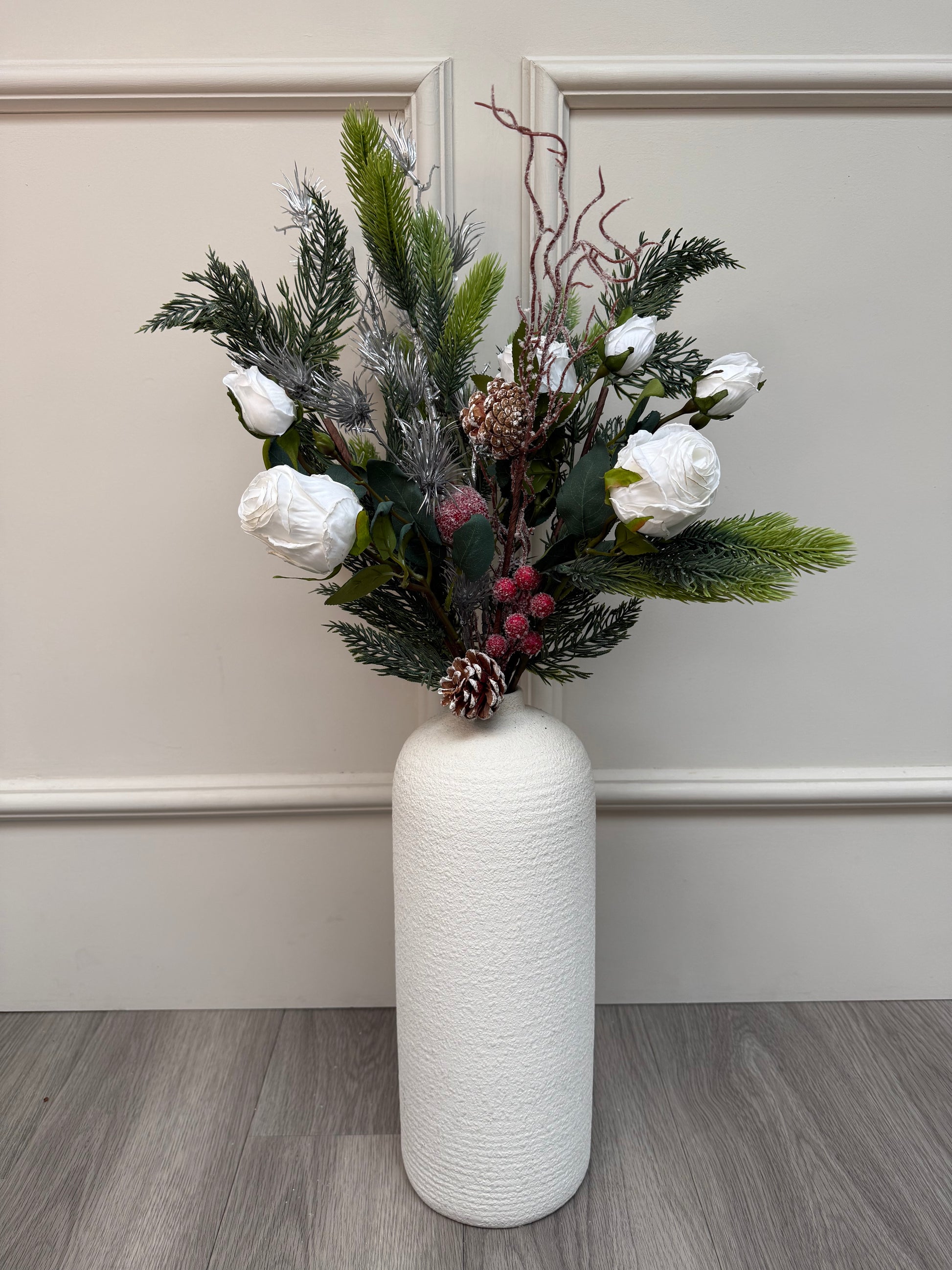 Bring the magic of winter indoors with the White Rose and Spruce bunch. Featuring crisp faux white rose buds, lush pine and spruce, pine cones, silver thistle, and frosty red berry twigs, this beautiful arrangement adds a fresh, festive touch that’s perfect for creating cosy, stylish ambience all season long.