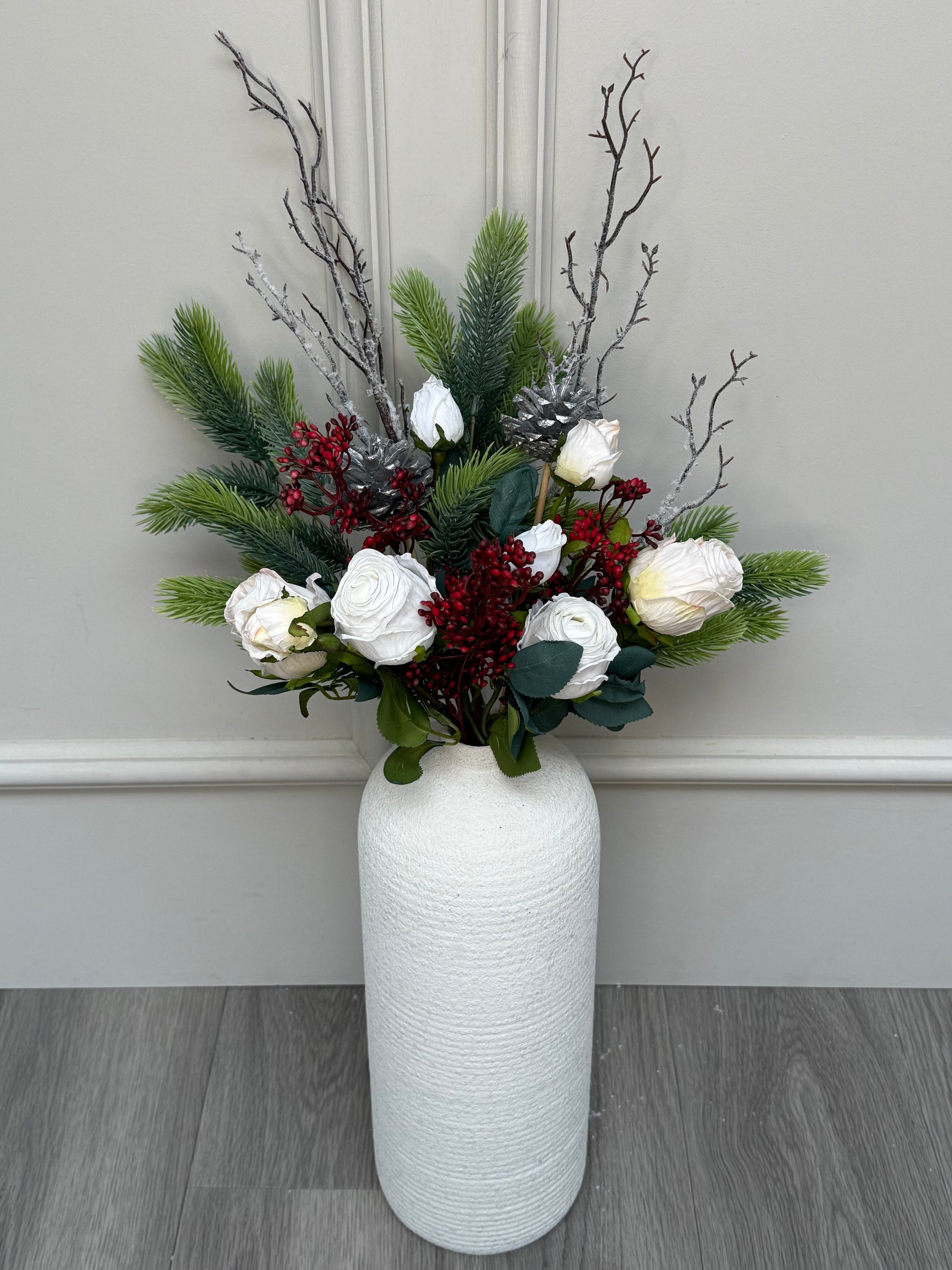 Refresh your winter décor with this stylish bunch of faux Winter Rose Buds in soft cream and white. Accented with seasonal red berries and green spruce, it offers a natural, realistic look that brings the season indoors. It requires no upkeep and won’t drop pine needles—perfect for hassle free winter styling.